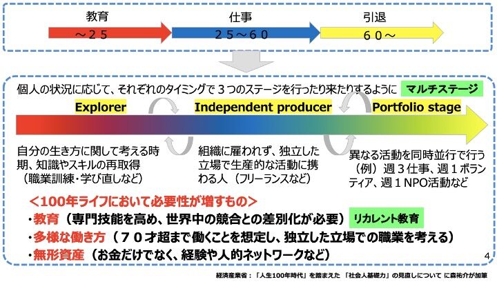 対して、新・社会人基礎力は社会人も対象に含まれています。人生100年時代になると、1つの職場で働くだけでなく、様々な事を学び続け、学ぶと働くを繰り返していくようになります(リカレント教育)。