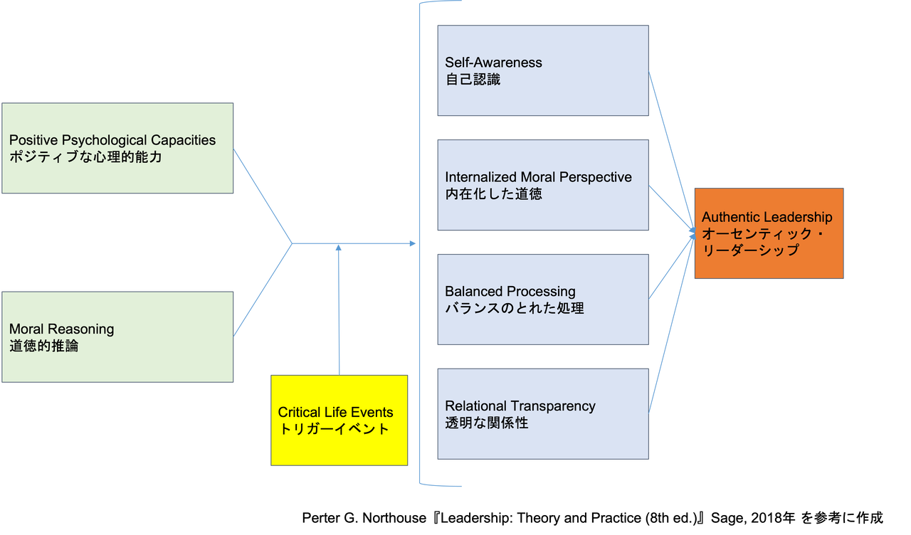 先行要因(個人史、トリガーイベント)と組織風土(インクルーシブ、倫理的、思いやり、強みベース)がある上で、リーダーは、セルフアウェアネス(価値観、アイデンティティ、感情、動機/目標)を高め、自己調整(内的基準との整合、バランスの取れた処理、関係の透明性、オーセンティック行動)を行う。