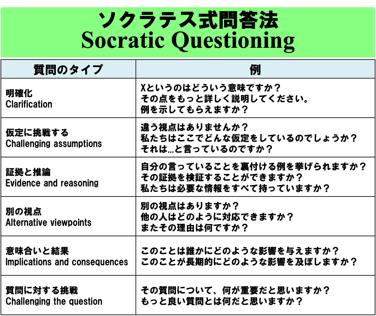 ギリシャのソクラテスに由来するソクラテス式問答法(Socratic Questioning)という手法があります。