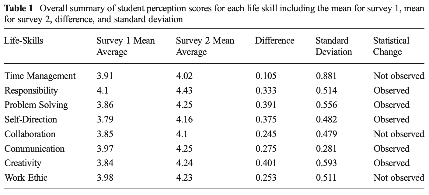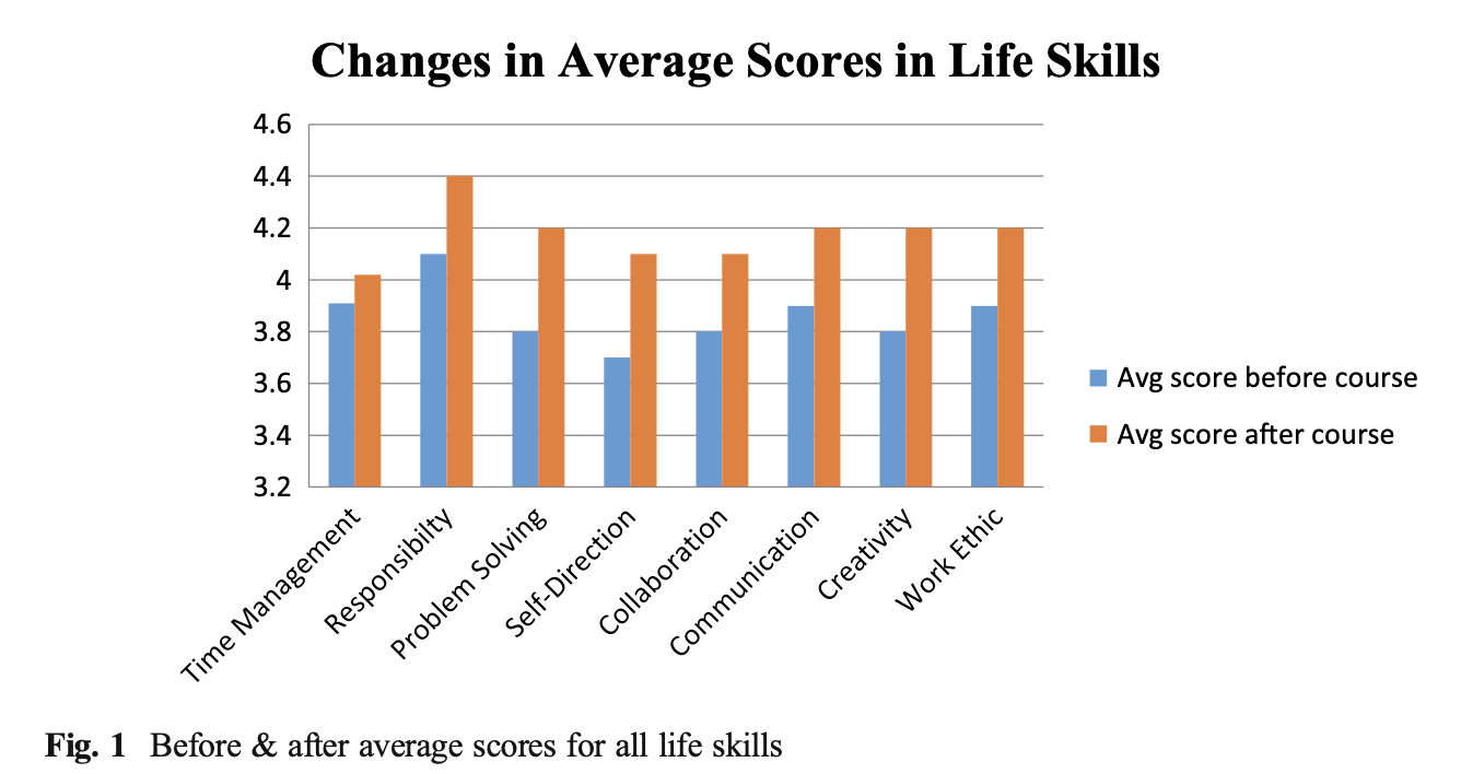 ・8つのライフスキルは全て授業後に向上しており、時間管理、協調性、労働意欲の3つを除く5つは統計的に有意が確認された。これは、PBLコースがライフスキルの発達に実際に影響を及ぼしたことを示唆している。