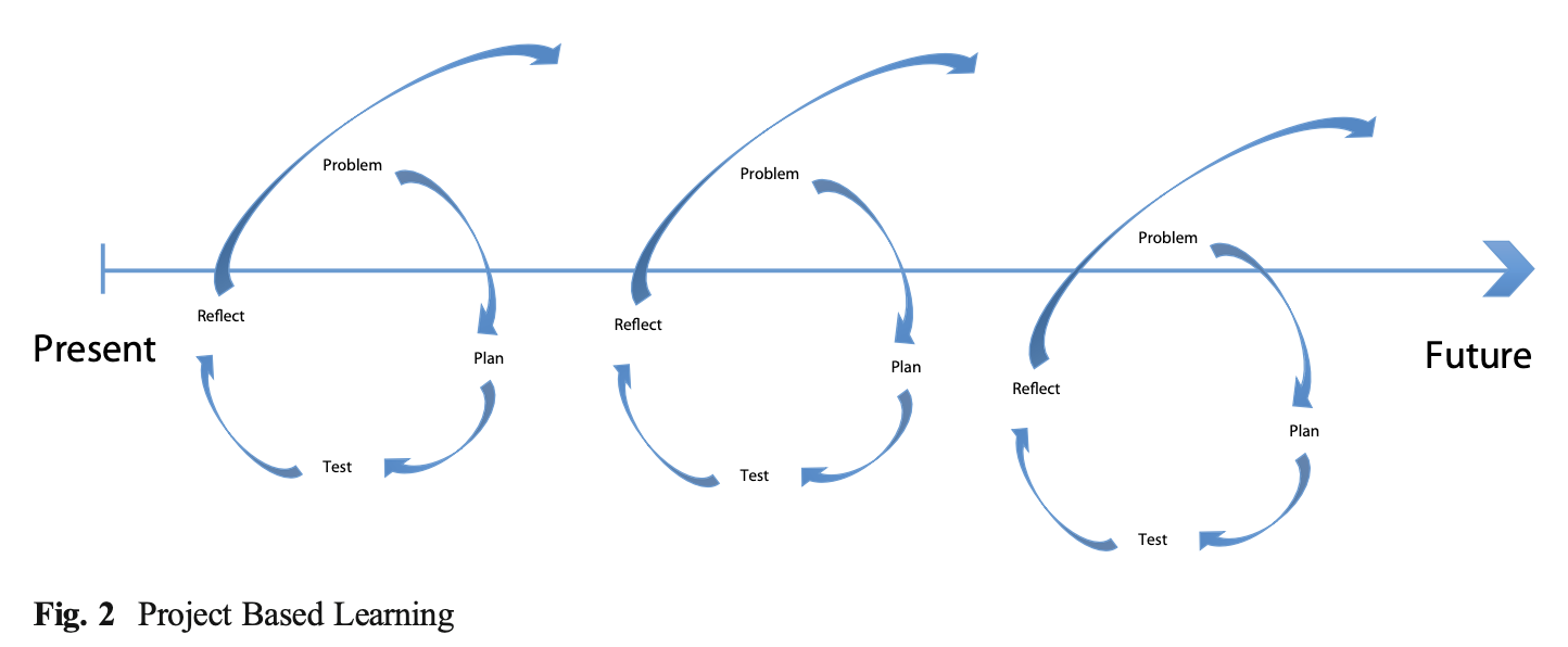 ・PBLモデル(Fig.2)は、学習プロセスが現在から始まり、一つの問題から次の問題へと螺旋状に未来へ向かっていく様子を示している。それぞれの問題に対して、解決策が得られたかどうかを判断するために、計画を立て、テストし、振り返る必要があり、そのスパイラルごとに、学生はライフスキルを使用し、学んでいるのである。
