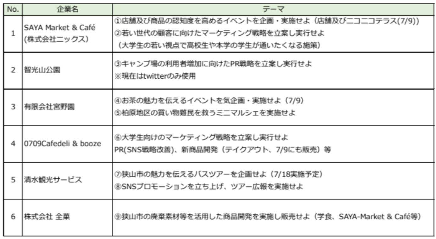 ※前期の授業では6社にご協力いただき、9チームに分かれてそれぞれのプロジェクトに取り組みました。