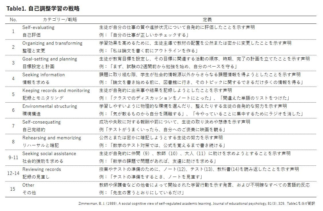 ZimmermanとMartinezPons(1986)は、高校生が一般的な学習状況で14種類の自己調整学習戦略を使用していることを発見し以下のようにまとめています(Table1)