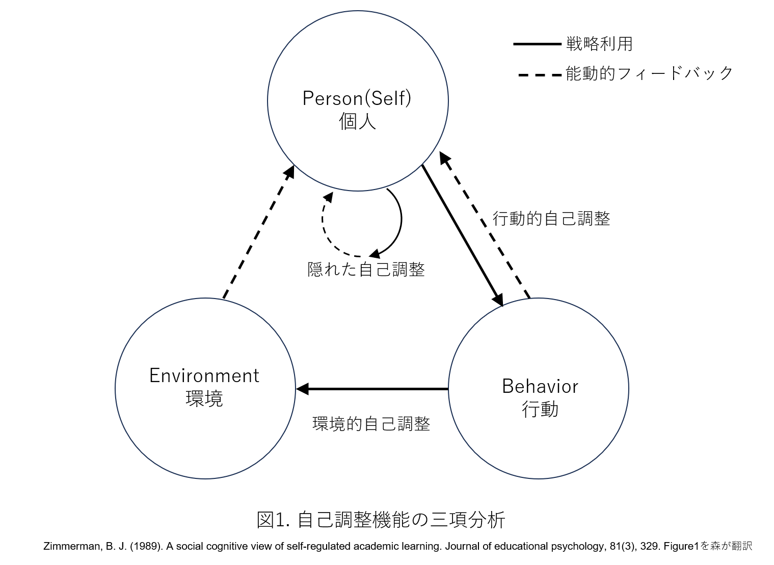 自己調整学習は個人のプロセスのみで決定されるのではなく、環境的、行動的な出来事から相互に影響を受けると仮定されており、それが上記の図で示されています。