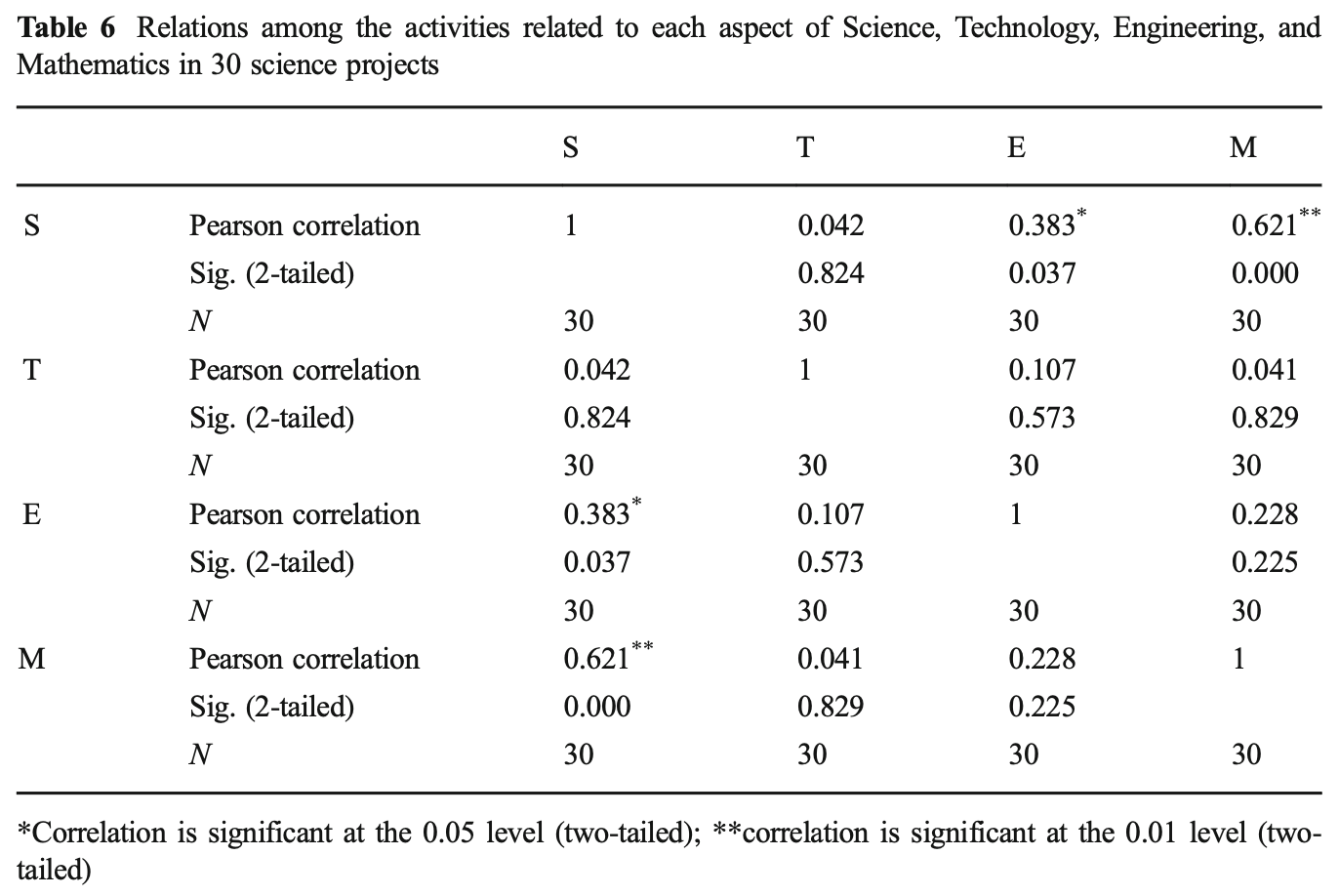 30の科学プロジェクトにおける科学、技術、工学、数学の4つの側面に関連する活動の出現率の相関がtable 6で示されています。ここからは、科学的活動は、数学的活動(r = 0.62、p < .01**)および工学的活動(r = 0.38、p < .05*)と有意に関連していることが、また、数学的活動は技術的活動とは相関がなく、技術的活動は他の3つの活動とは相関がないことが明らかになっています。