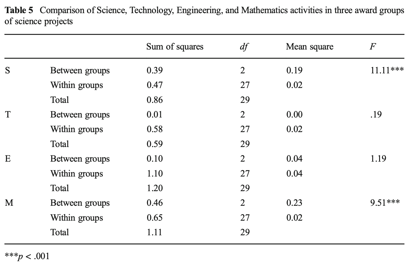 また、STEM活動に統計的なグループ差が存在するかどうかを明らかにするために、一元配置分散分析を実施(Table 5)。科学的活動と数学的活動の両方に有意なグループ差があり(p < .001)、Outstandingプロジェクトとmeritプロジェクトでは、consolationプロジェクトよりも科学的活動と数学的活動がはるかに多いことが確認されています。