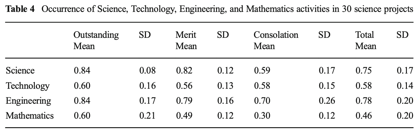 科学、技術、工学、数学の各活動の平均値を示したTable4によると、生徒の科学プロジェクトのレポートでは、技術や数学の活動よりも工学や科学の活動が多く確認されています。