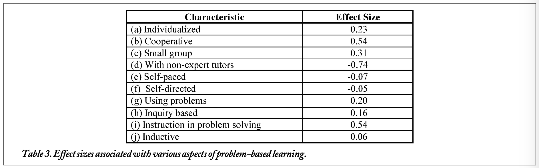 ・NormanとSchmidt(2000)は、PBLのいくつかの要素を特定し、それらが学習成果にどのような影響を与えるかを示しており、その結果は、Lipsey and Wilson(1993)が提供したメタ研究の要約(測定された学習成果は学業達成度)を用いて、Norman and Schmidtから直接引用したTable 3に示されている。