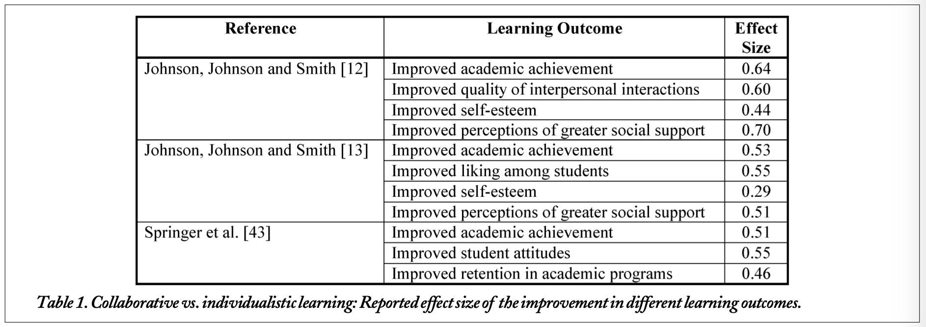 ・Johnson, Johnson and Smith(1998)は、90年にわたる研究のレビューにおいて、協力は個人作業と比較して学習成果を全面的に向上させることを発見