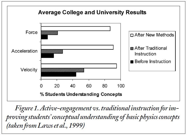 ・Figure 1はLawsら(1999)の論文から引用したもので、基本的な物理の概念の理解を向上させるためには、能動的な学習方法が従来の指導を上回ることを示しており、この差は非常に大きい