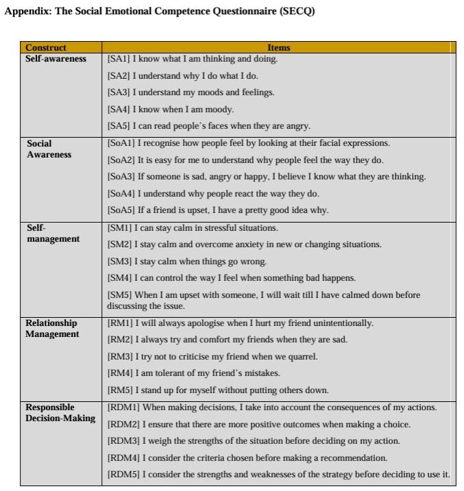 Zhou, M., & Ee, J. (2012). Development and validation of the social emotional competence questionnaire (SECQ).