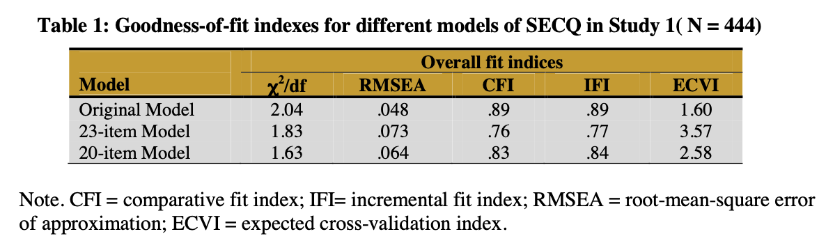 ・CFIとIFIのいずれも0.90を超えなかったが、オリジナルモデルのみが、これらの2つの指数において非常に近い値を示し、妥当なモデル適合を示した