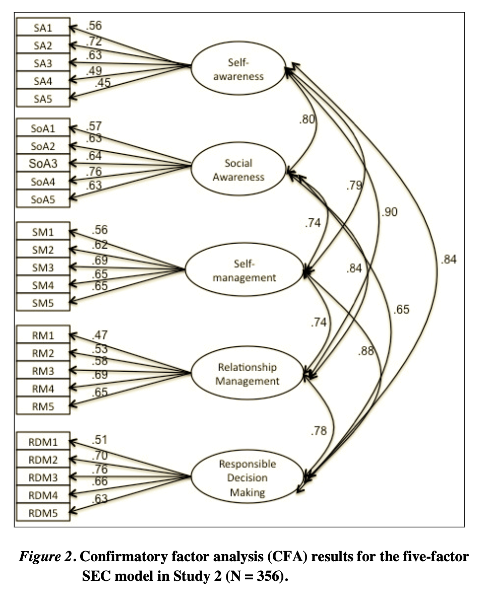 ・全サブスケールは、許容範囲内の内的整合性を示した。自己認識、社会に対する認識、自己管理、人間関係管理、責任ある意思決定の各クロンバックのα係数は0.62、0.72、0.68、0.62、0.72であった。