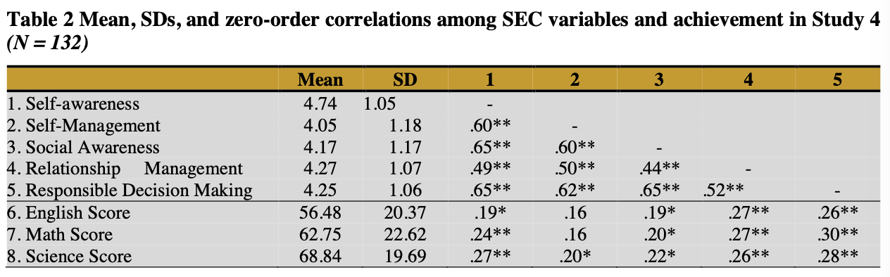 ・SECのほとんどの側面は試験のスコアと有意に正の相関関係(低〜中)にあった(.19