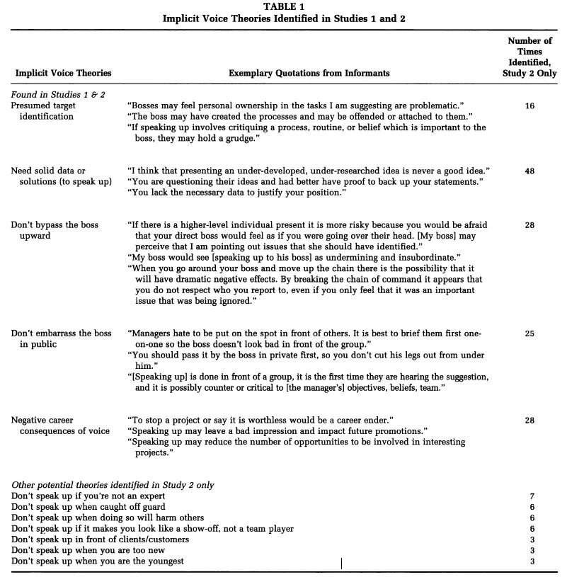 Detert, J. R., & Edmondson, A. C. (2011). Implicit voice theories: Taken-for-granted rules of self-censorship at work. Academy of management journal, 54(3), 461-488.