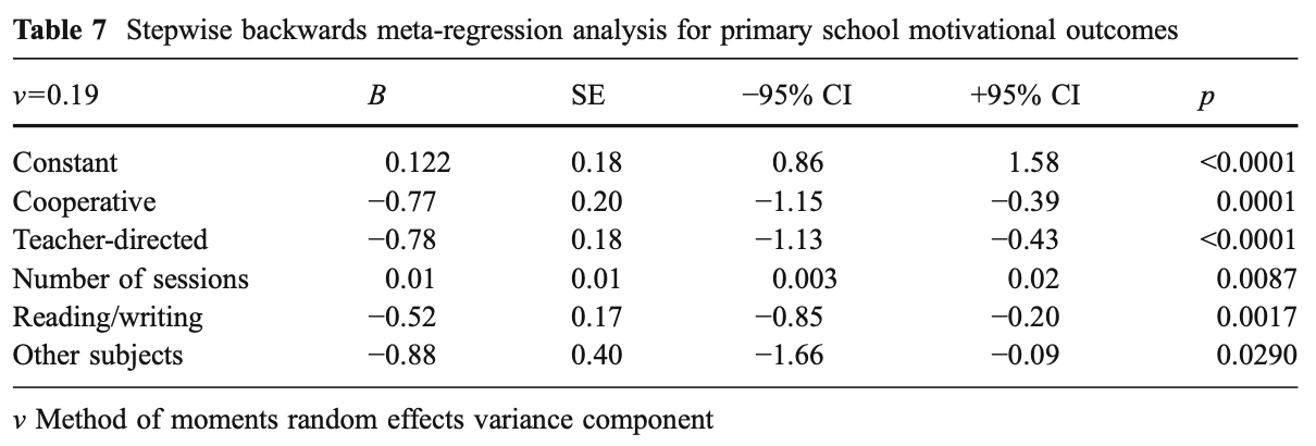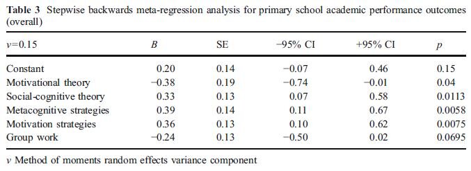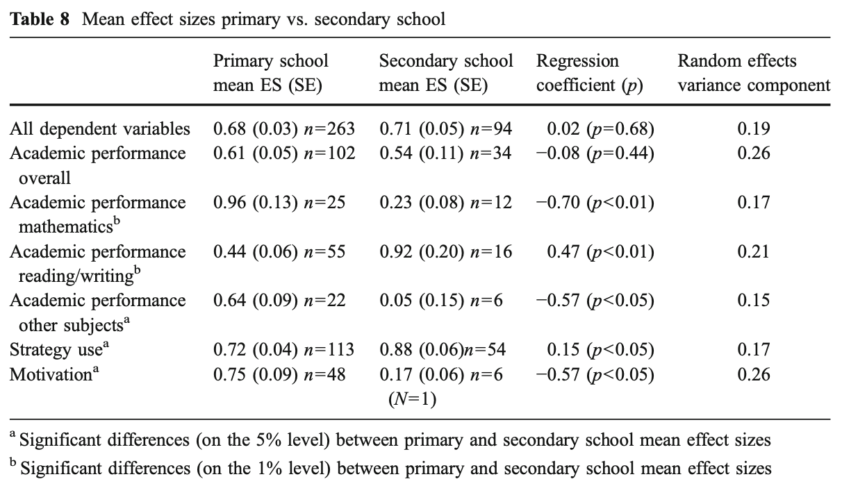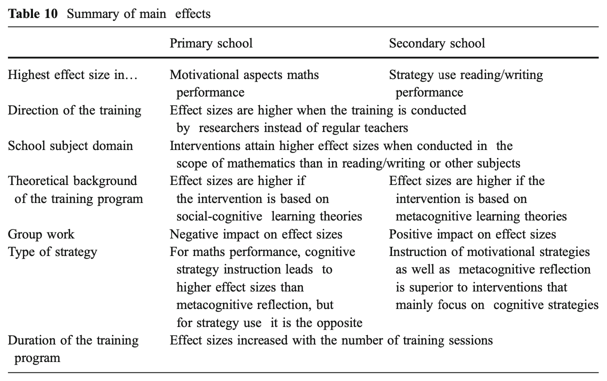 ・生徒の方略使用に関しては、自己調整型学習の動機づけの側面を強調する理論を背景に介入プログラムが開発された場合、小学校レベルでの効果の大きさはより高くなる。