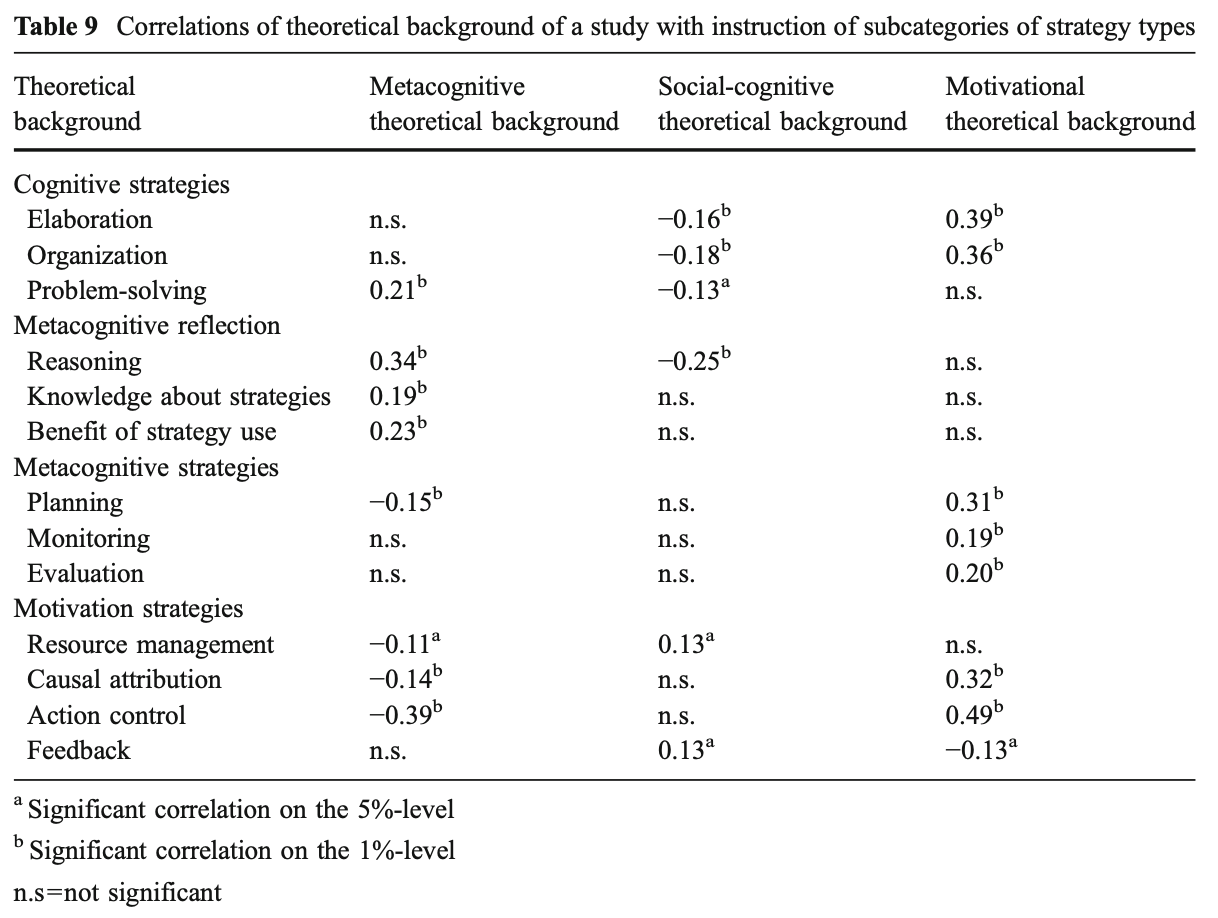 ・メタ認知的方略の指導、すなわち学習プロセスを計画、監視、評価するといった指導自体は、学習成果、方略の使用、動機づけを向上させるものではない(自己調整学習の促進を効果的なものにするには、いくつかの補足的な要素が必要)