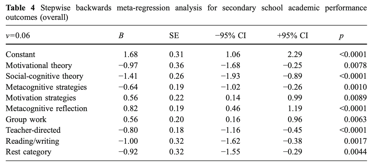 ・介入がメタ認知的方略と動機づけ方略の指導を含んでいる場合、含まない場合よりも効果量は高くなる
