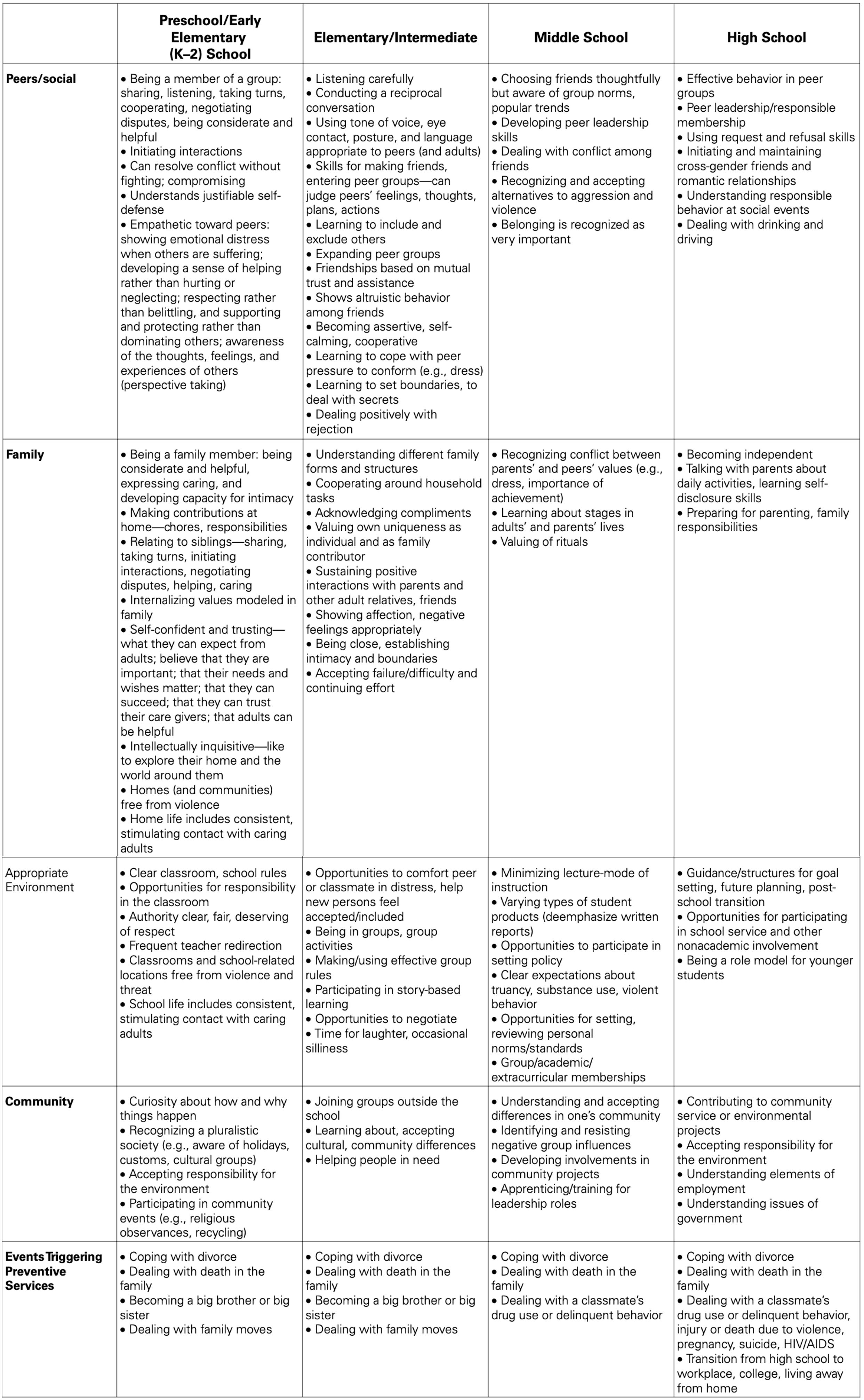 SELの主要領域は4つ(1. 生活スキルと社会的コンピテンシー、2. 健康増進と問題予防スキル、3. 対処スキルと移行期や危機に対する社会的支援、4. 積極的で貢献的な奉仕活動)に分類され、その4つの領域のそれぞれにおける成功には、情動、認知、行動におけるスキルの調整が関わっているとされています。また、社会情動的スキルは幼児期に始まり、発達段階ごとに適切な形でSELを導入することが、生徒の成長を支える鍵だと言われています。それらをまとめたのがAppendix Aの表(Curriculum Sc ope for Different Age Groups)です。