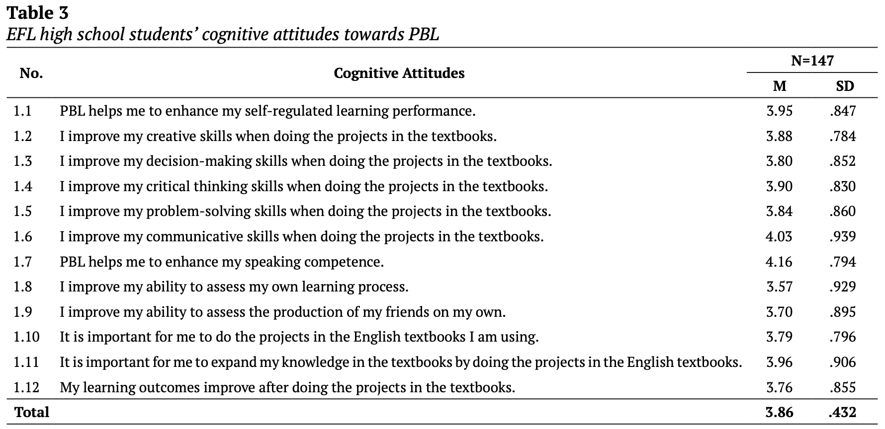 ・PBLに対する認知的態度は、肯定的(M=3.86; SD=.432)であった(Table 3)