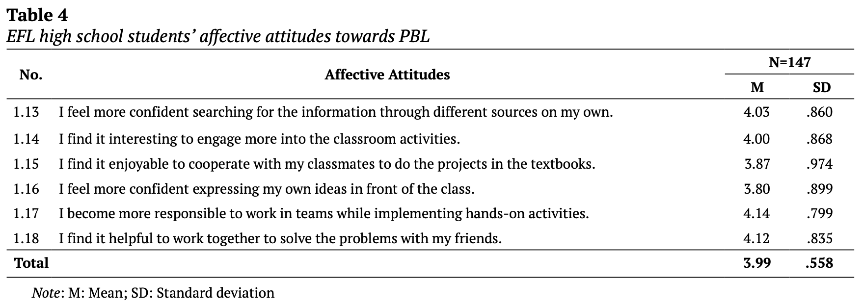 ・PBLに対する生徒の態度の総平均点はやや高かった(M=3.83; SD=.42)(Table 1)