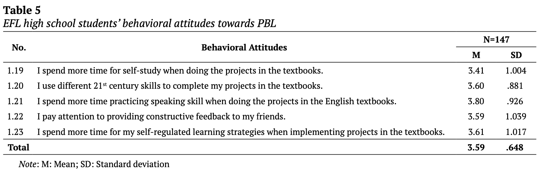 ・生徒はPBLが自己調整学習のパフォーマンスを高めるのに役立ったことに同意(M=3.95; SD=847)。