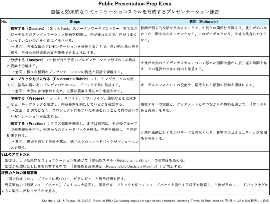 ・生徒がフィードバックをもとに自身の成果物を洗練させた後、次はそれを公に発表する準備を行う・公開プレゼンテーションを成功させるには、実用的なコミュニケーション能力が必要であり、これは、PBLにおいて最も重要なスキルの一つであり、PBLを通して養われる