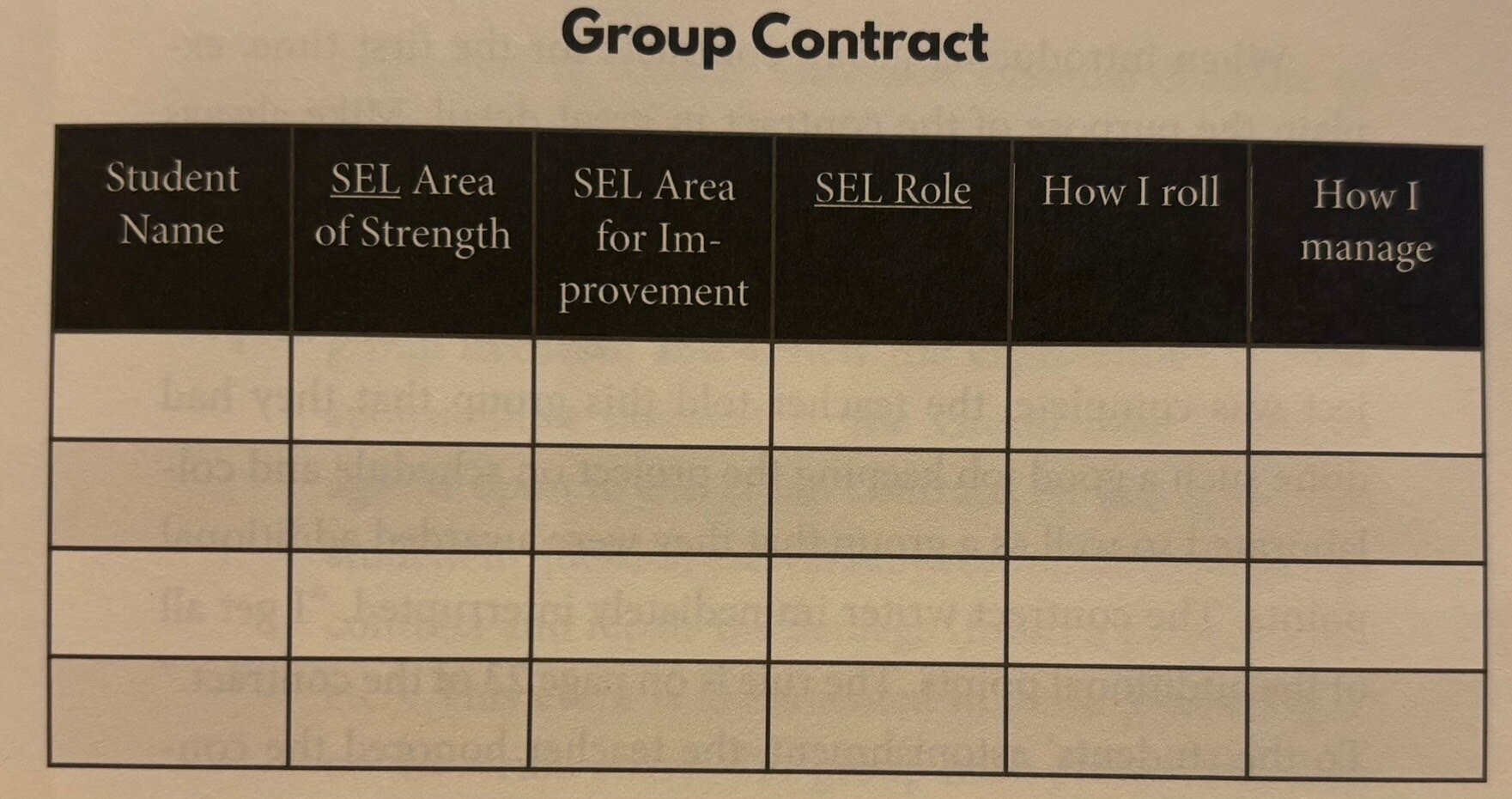グループ契約を初めて導入する際には、グループ契約の目的を非常に丁寧に説明することが重要である。マイクは、契約書を作成したボランティアの生徒についての話をいつもする。この文書は最終的に30ページにもなり、グループ全員が署名した。プロジェクトが完了した後、教師はこのグループに、プロジェクトを予定通り進め、協力して取り組んだことを評価し、追加ポイントを与えることを伝えた。その時、契約作成者の生徒はすぐに「その追加ポイントは全部私のものです。契約書の23ページに書いてあります」と言った。教師はこの「でっち上げの話」をそのまま受け入れた。これは作り話だが、マイクは生徒たちにグループ契約を真剣に扱うことの大切さを伝えるためにこの話を使っている。