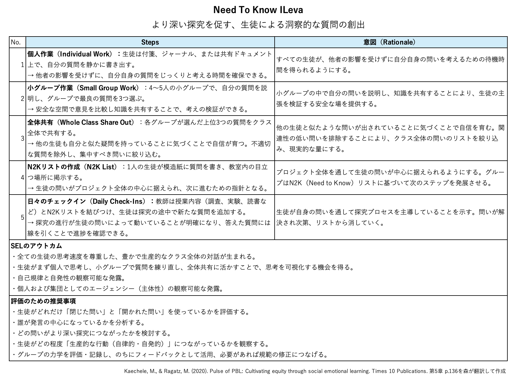 本章では、具体的な方法論として「規範と習慣」「Need to Knows」「生徒のためのプロジェクトマネジメント」「セルフアセスメント」の4点から説明されており、どの部分からも沢山の学びがありました。