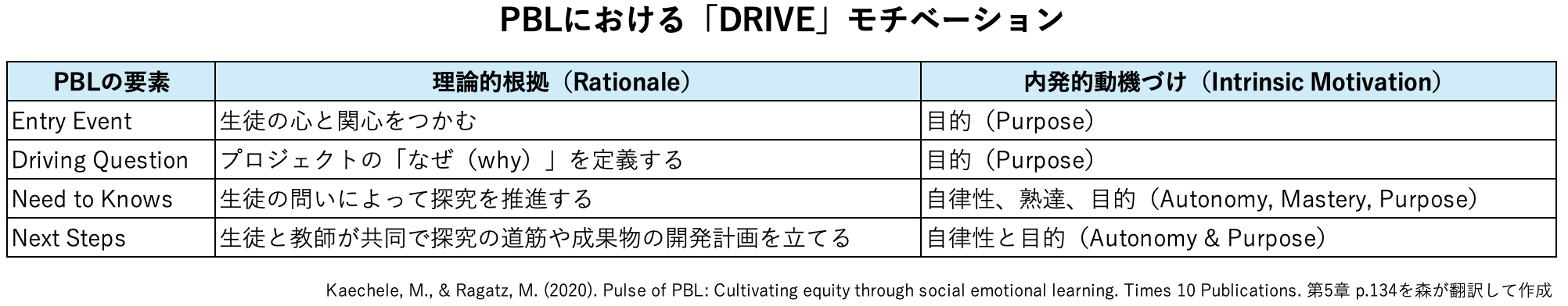 ・ダニエル・ピンクはの著書『Drive』の中で語られている、内発的動機づけの3要素「自律性(autonomy)」「熟達(mastery)」「目的(purpose)」について、PBLの要素と突合して整理したのが以下の表