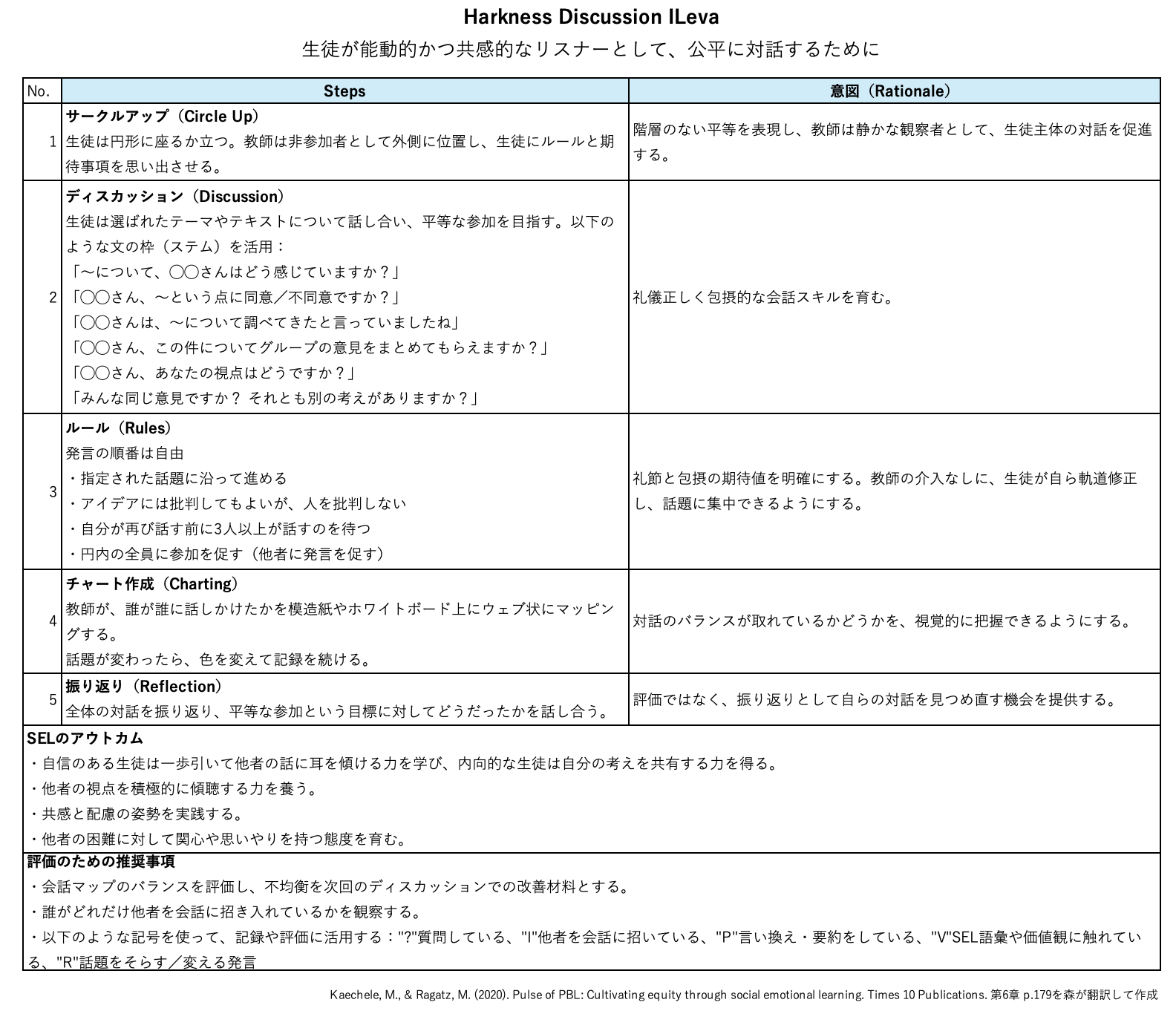 ・ソクラテス式セミナー、フィッシュボウル、トーキング・サークル、ハークネス・ディスカッションなどは、次のような発話スキルを教える手法(傾聴、言い換え、発言前の間の取り方、会話空間の共有、そして全員の参加を促すこと等)